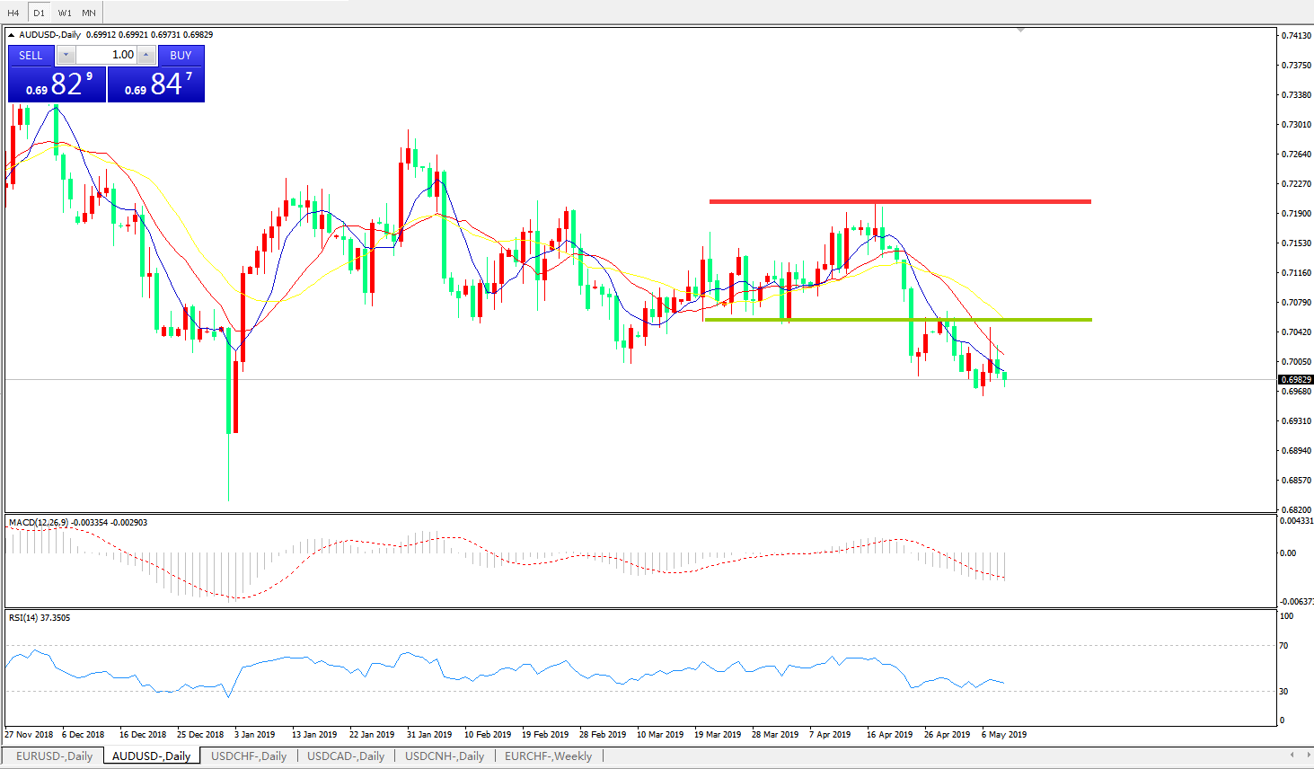 技术面简析:日图均线有序空头排列看跌汇价多空转折区域短暂反弹后重归下行MACD下穿0轴且动能柱0轴下方放量,RSI缓步走低预计汇价将进一步下行