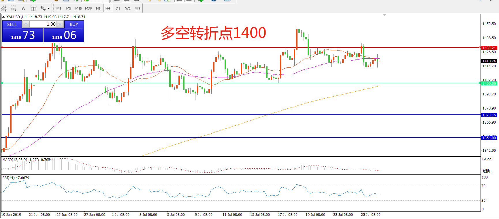 4小时图看,金价呈现窄幅整理形态, 1430成为短期阻力,1400成为下方支撑,200均线逐渐上行,MACD红柱缩短,RSI指标向上,短期震荡格局不改,中期走势仍然偏多。