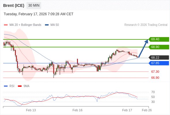 在 67.85 之上,看涨,目标价位为 68.90 ,然后为 69.40 。