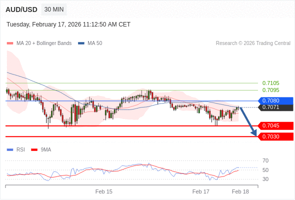 在 0.7080 之下,看跌,目标价位为 0.7045 ,然后为 0.7030 。