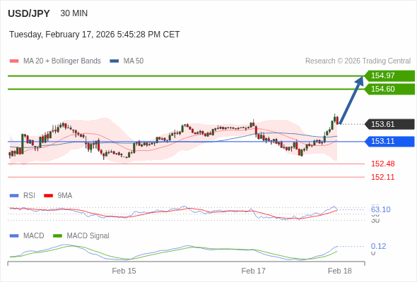 美元/日元 当日内 : 看涨,当 153.11 为支撑位。