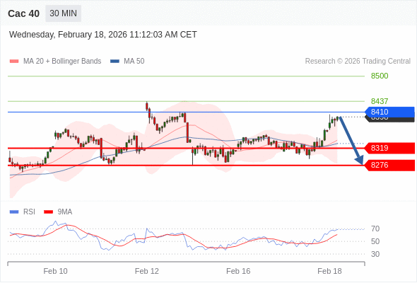 Cac 40 当日内: 短期关键阻力位在8410。