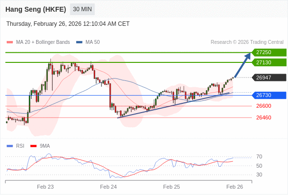 在 26730 之上,看涨,目标价位为 27130 ,然后为 27250 。