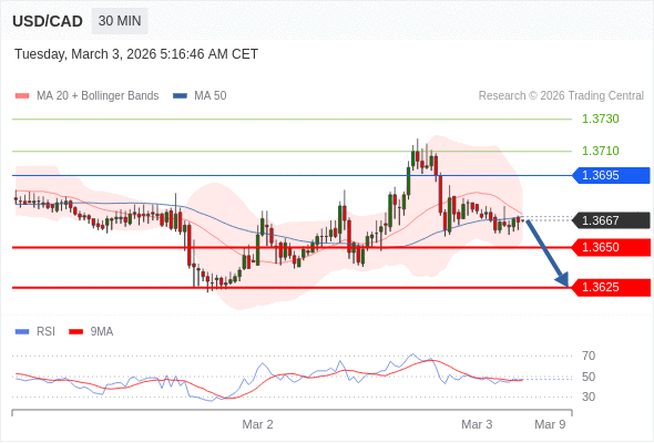 美元/加元 当日内: 目标位为1.3650。