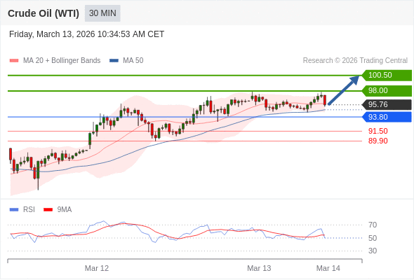 在 93.80 之上,看涨,目标价位为 98.00 ,然后为 100.50 。
