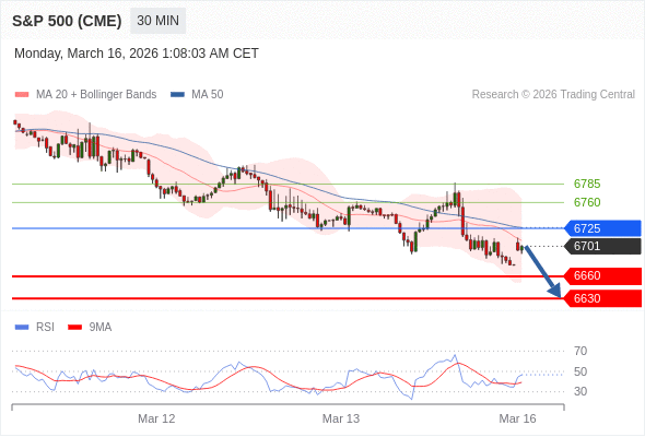 美国标普500指数期货 (M6) 当日内: 短期关键阻力位在6725。