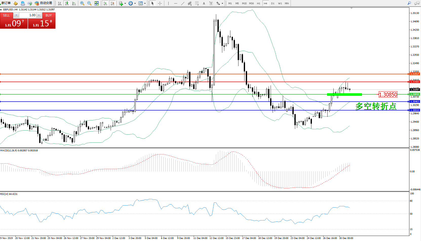 交易策略:1.30850上方看涨,目标1.315031.31917