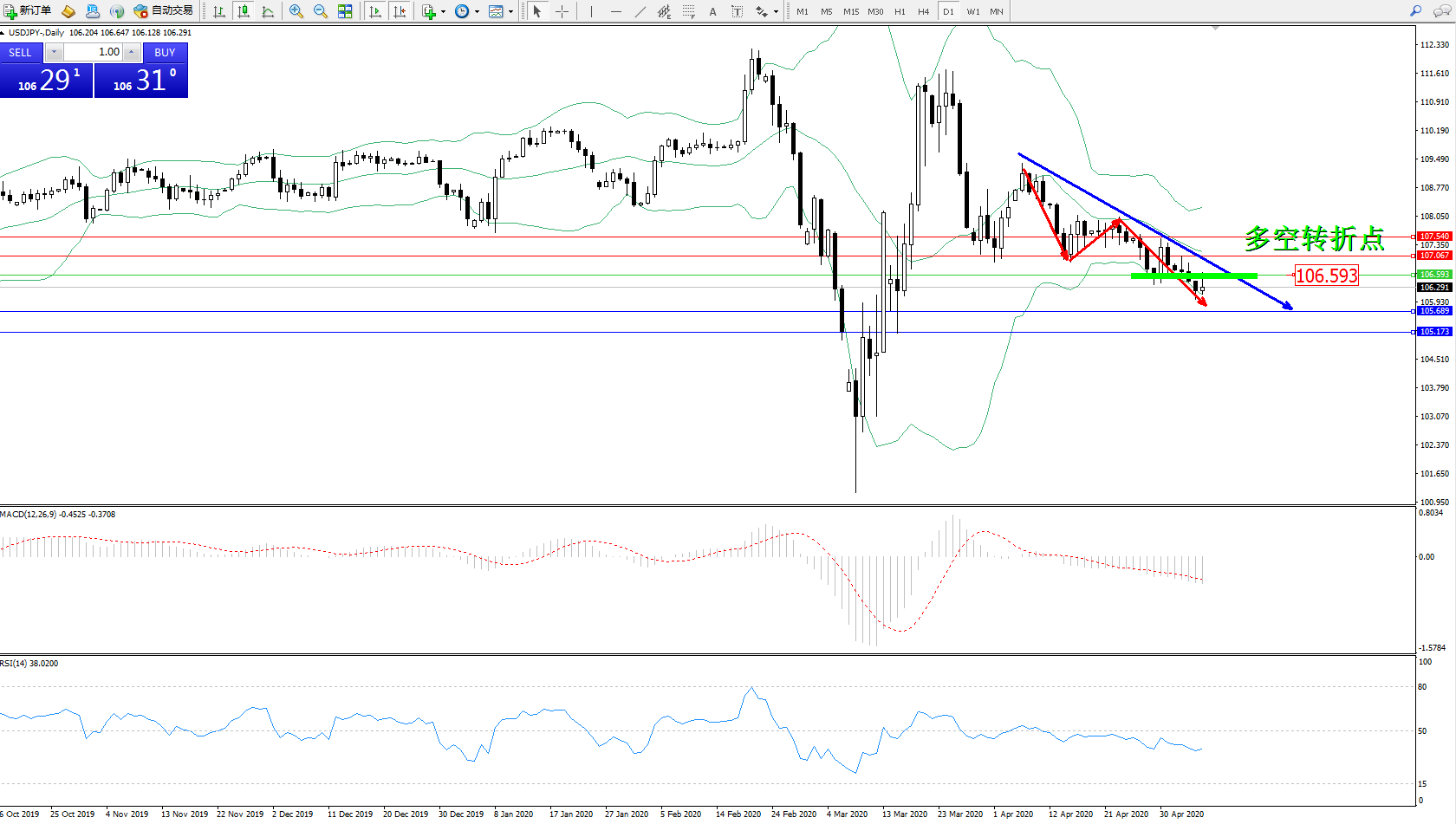 交易策略:106.593下方看跌,目标105.689105.173
