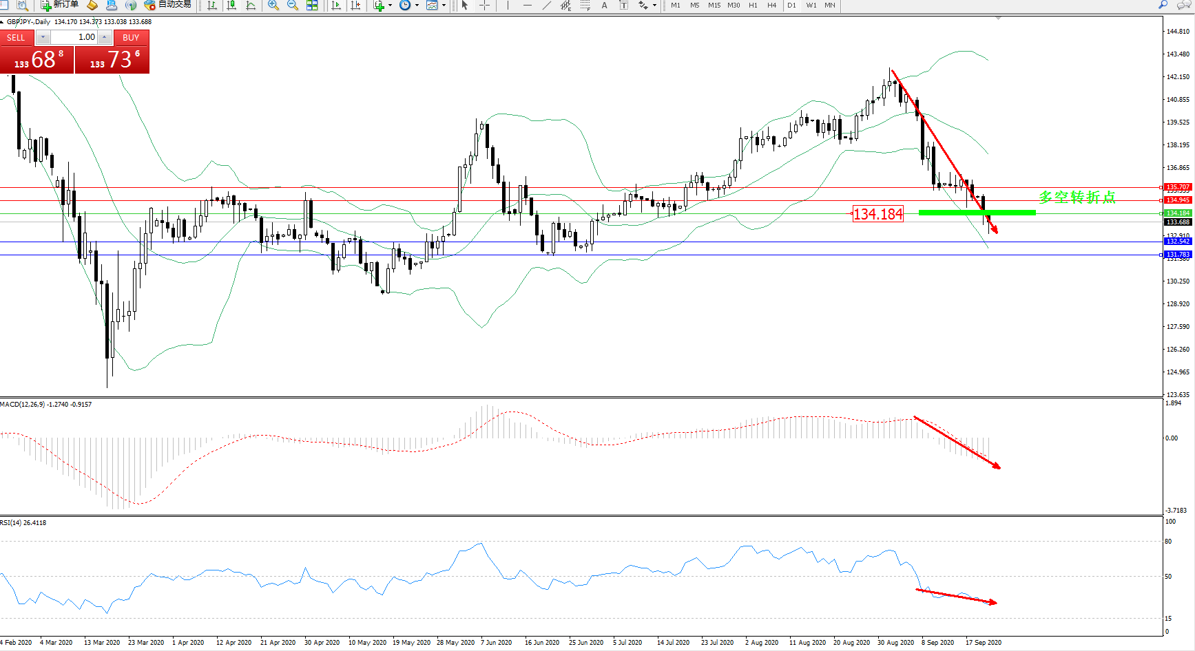 交易策略:134.184下方看跌,目标132.542、131.783