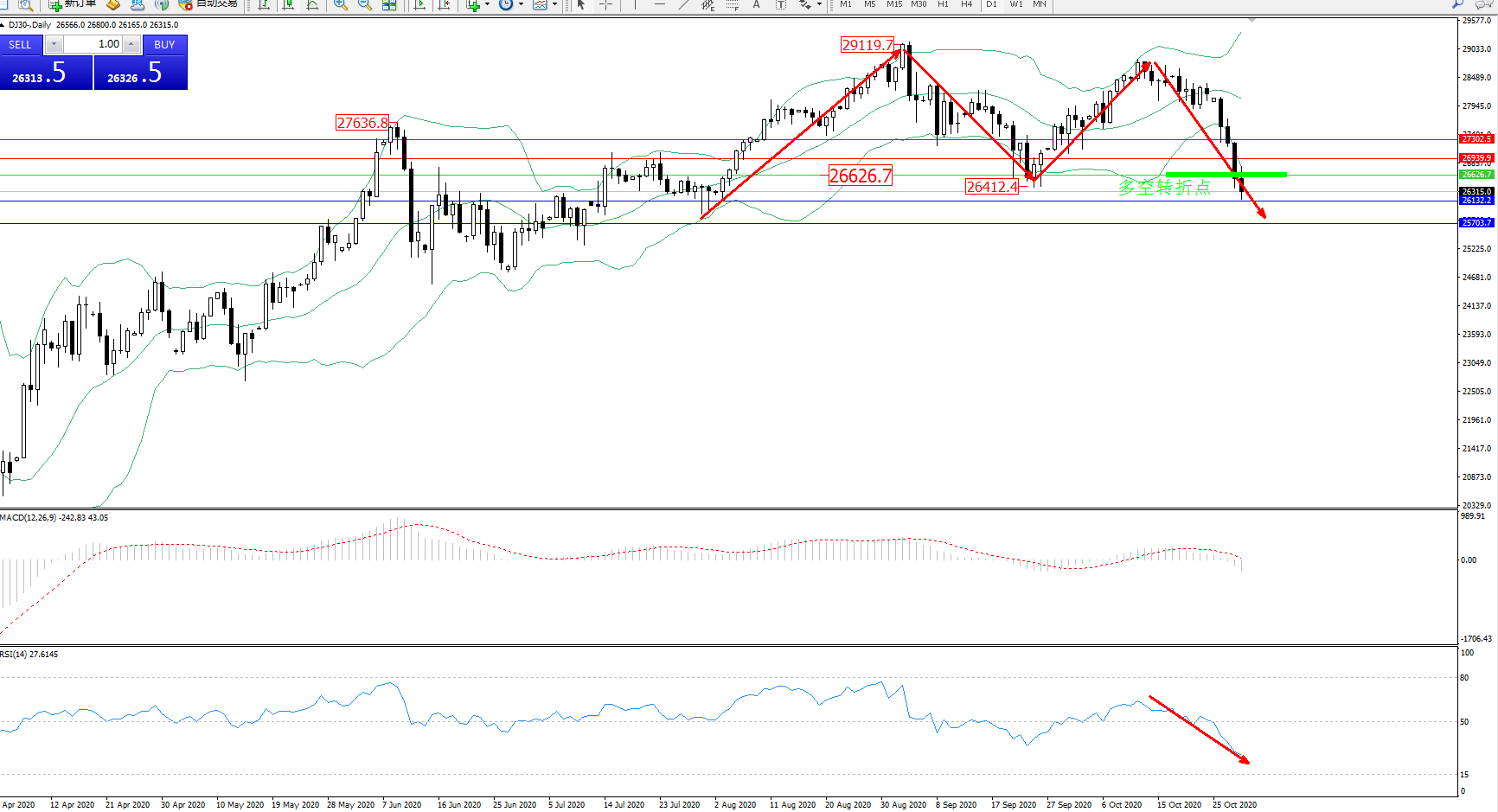 道琼斯指数10月29日(周四)收盘上涨139.30点,涨幅0.53%,报26659.24点。美国股市从周三创下的四个月最大跌幅中反弹,尽管投资者仍对不断升温的新冠疫情保持警惕,但强于预期的经济数据令市场信心受到鼓舞。美国中西部地区新增病例数创新高,东北部地区新增病例数7天均值达到5月以来最高水平。意大利又创下单日新增最高纪录,可能实施新的限制措施。GDP数据表明这种情况会结束,不是所有消息都是负面的,至少某种程度上我们看到了经济复苏;另一方面,疫情方面的消息似乎都在预示着将停摆,将增加限制措施。美国第三季经济成长创下纪录,且初请失业金人数趋势改善,这些数据提振风险意愿并提振股市,盘初这些数据损及作为避险工具的美元。