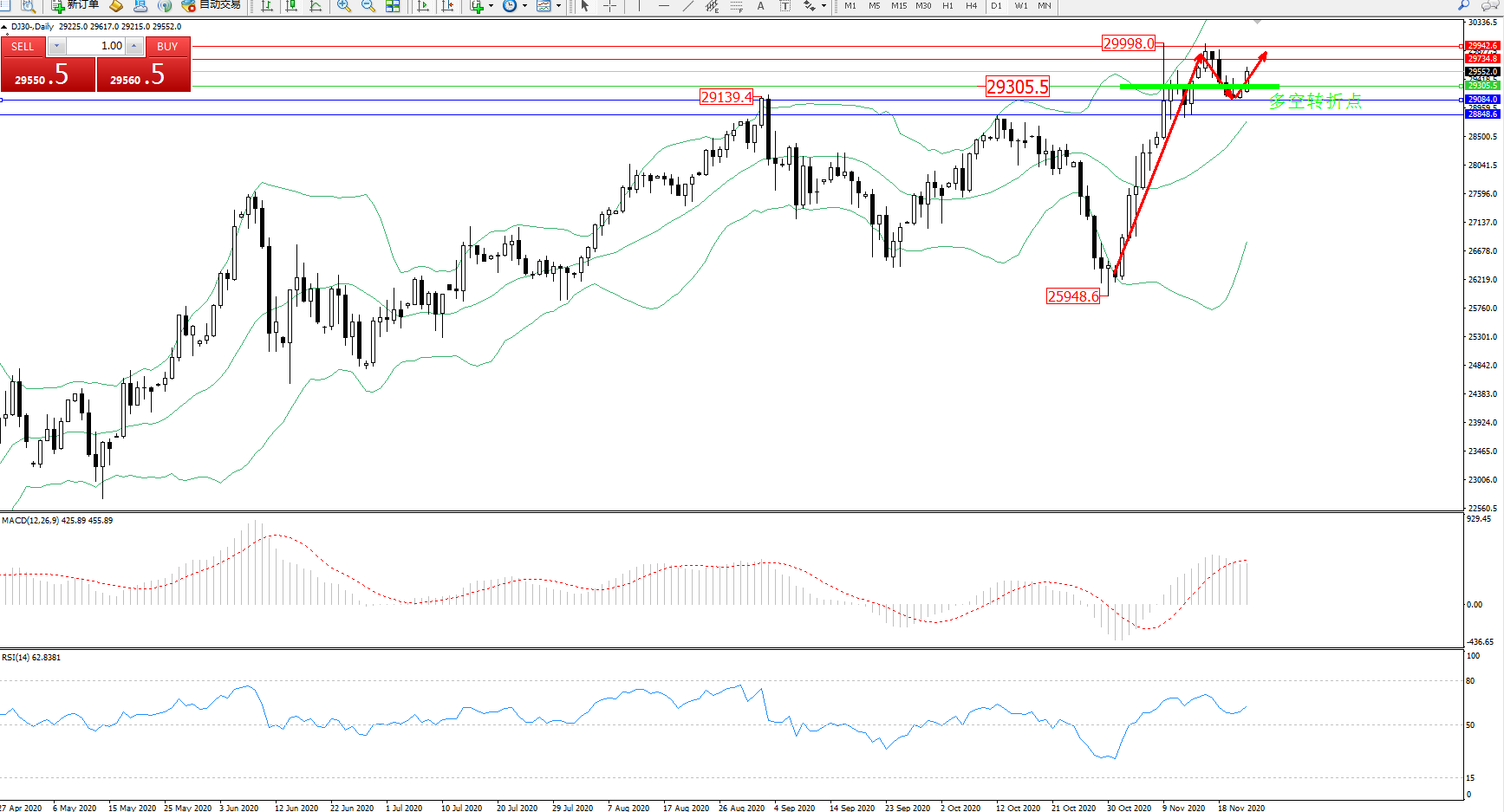 道琼斯指数11月23日(周一)收盘上涨327.80点,涨幅1.12%,报29591.27点。美股三大指数集体收涨,资者增持将从经济活动正常化中受益最多的公司,科技股跑输,疫苗的成功最近提振了市场的冒险情绪,即使疫情仍在蔓延,投资者已经开始抢购将从解除防疫封锁和旅行限制中受益的股票。有关拜登将提名珍妮特·耶伦出任财政部长的消息一度利好,市场认为珍妮特·耶伦出任财长对市场有利。至少,她很可能与美联储主席鲍威尔合作良好。新冠疫苗开发取得进展的消息预示需求前景有所改善。在新冠疫苗下个月获批后的一两天内就开始为医务工作者等群体接种。美国芝加哥联储主席埃文斯:美国经济遭遇新冠肺炎疫情沉重打击,目前正在复苏;不会在2021年春季之前对美国经济有一个很好的认识;预计美联储不会在2023年后期、甚至2024年之前加息。若没有财政支持,利率将在更长时间内保持低位,资产负债表也将扩大。