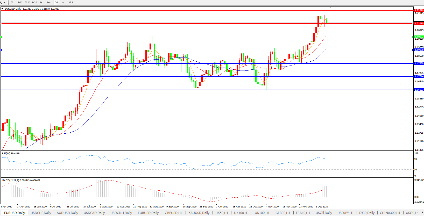 技术面简析:日图均线呈有序多头排列,汇价弱势小幅回落,MACD运行于0轴上方且量能0轴上持续放量 ,RSI超卖区域小幅走弱,预计短期汇价大概率将在整理后进一步上行。