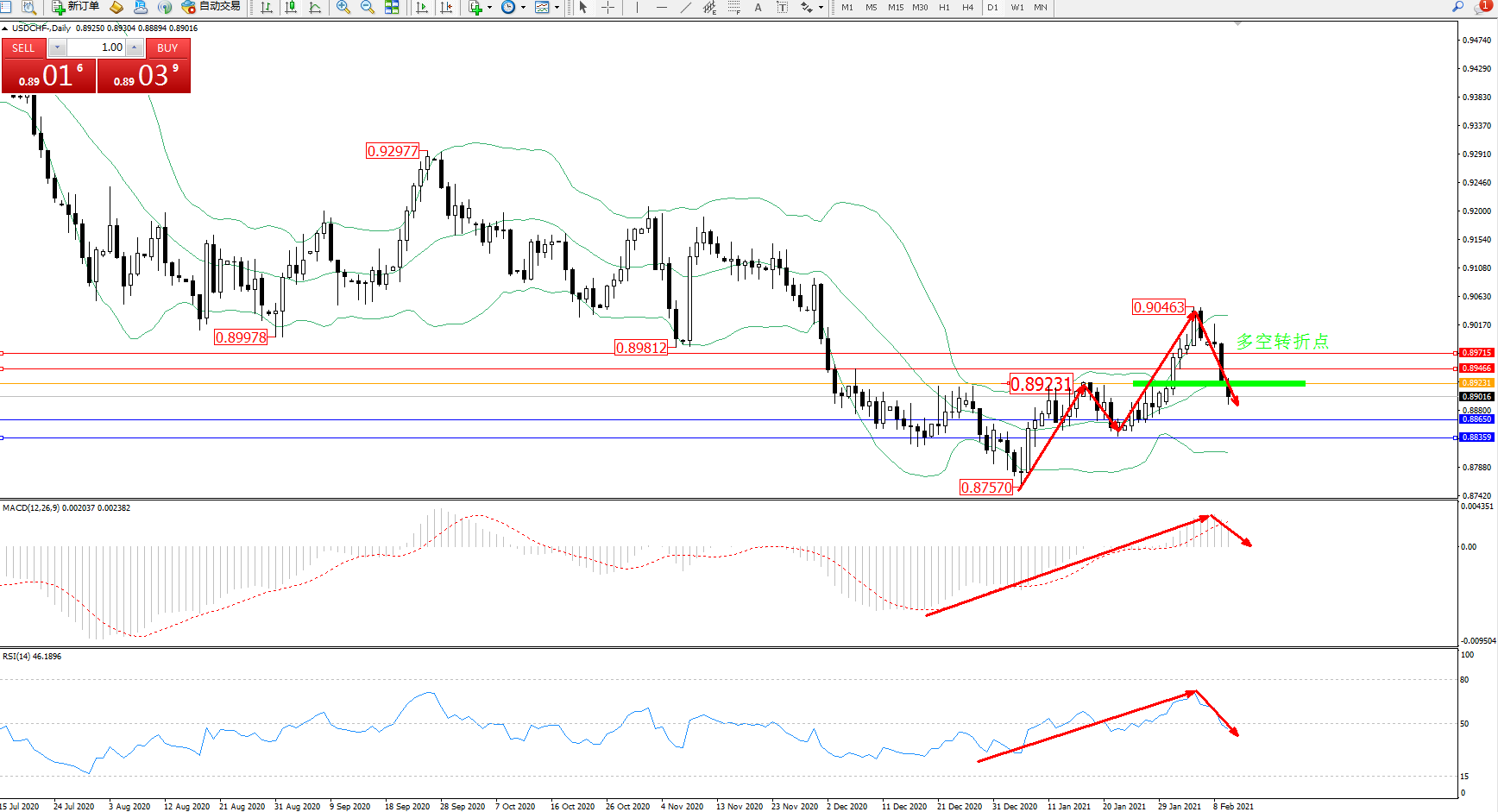 备选策略:0.89231上方看涨,目标0.89466、0.89715