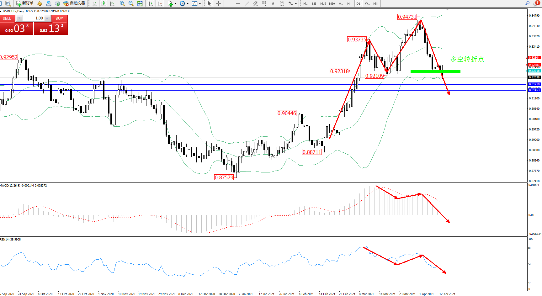 交易策略:0.92318下方看跌,目标0.91718、0.91453
