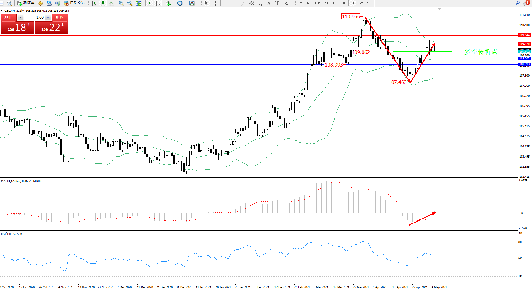 技术点评:高位空头动力延续空头下行走势持续下挫,触及布林带指标下轨附近节点后不断向下移动,空头动力下行至107.463附近得到支撑短暂整理后急速回升,突破中轨触及上轨附近后遇阻开始震荡,布林带指标呈张口走势后开始缓慢收口中,MACD指标处于0轴线下方空头区域持续震荡后开始有回升迹象,RSI指标处于空头区域整理后急速反转上行,在50均衡线节点上方弱势震荡;