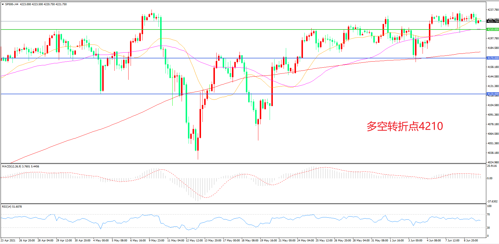 4小时图看,标普500延续高位震荡,多空博弈胶着,4210成为短期多空分水岭,均线系统成为下方支撑,MACD红柱增加,RSI指标走平,日内震荡上行概率较大。