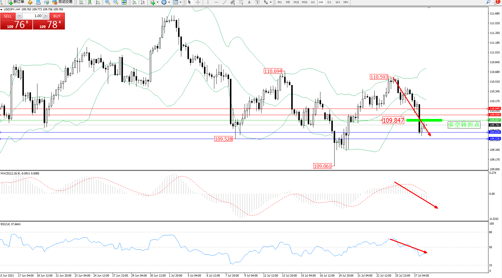 交易策略:109.847下方看跌,目标109.639、109.528