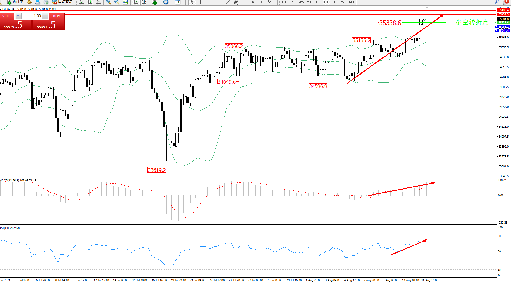 道琼斯指数DJ30——4小时K线图显示: