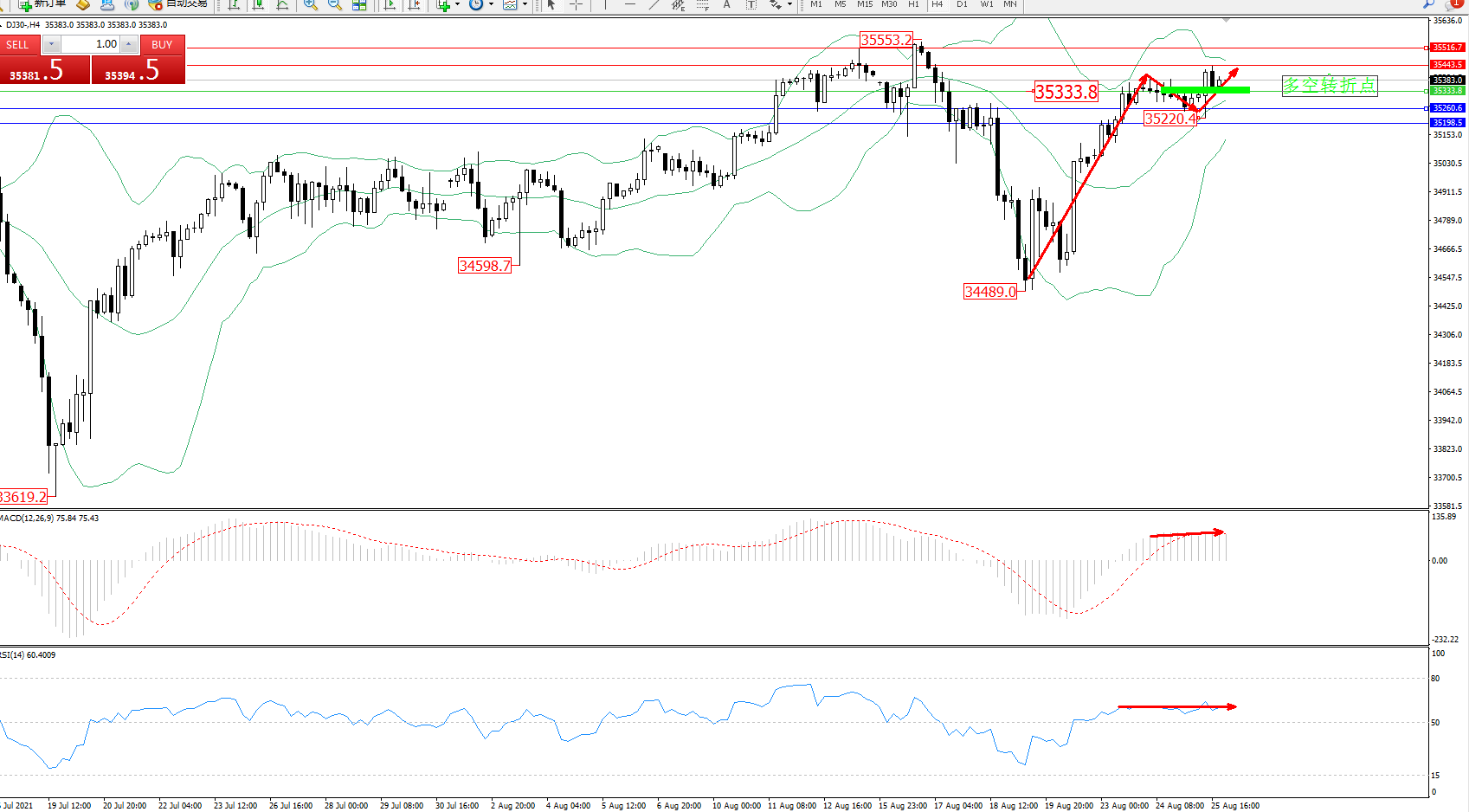 道琼斯指数DJ30——4小时K线图显示: