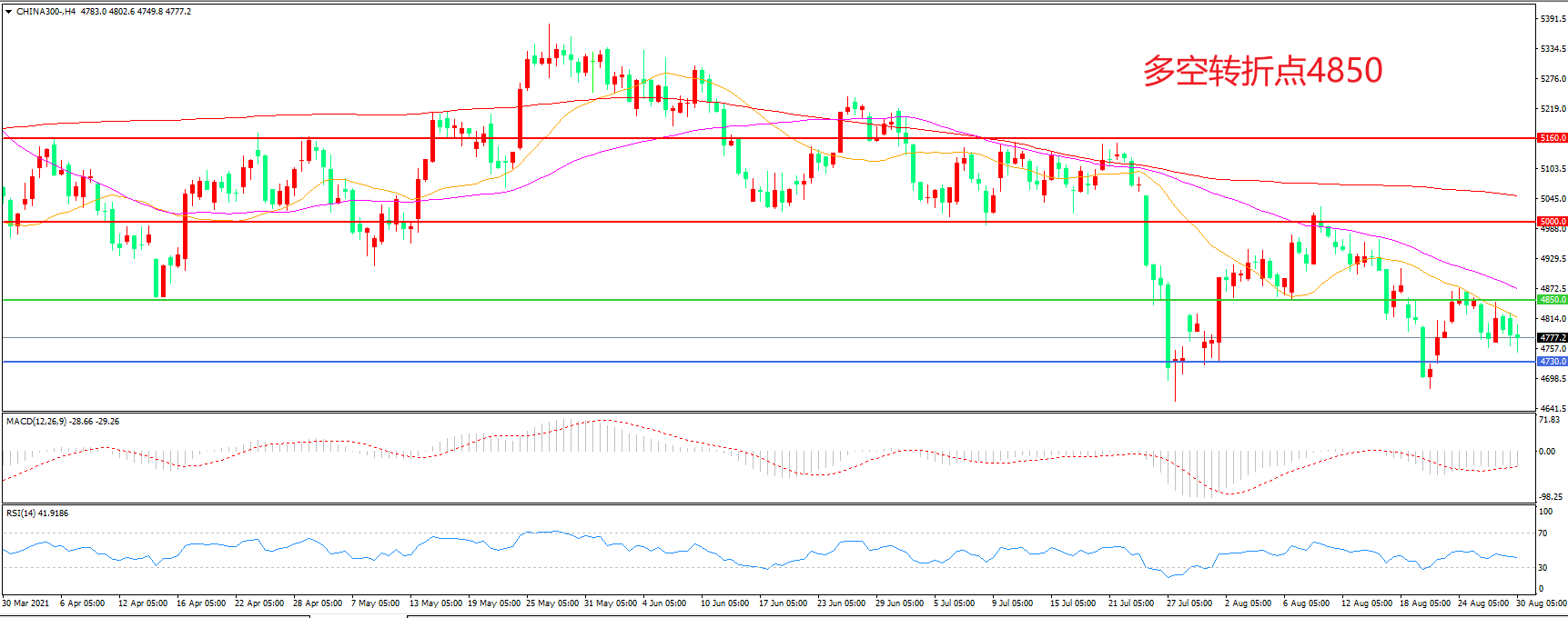 4小时图看,沪深300受到均线系统的压制连续回落,弱势震荡迹象明显,4850成为短期分水岭,MACD绿柱缩短,RSI指标走平,日内下行概率较大。