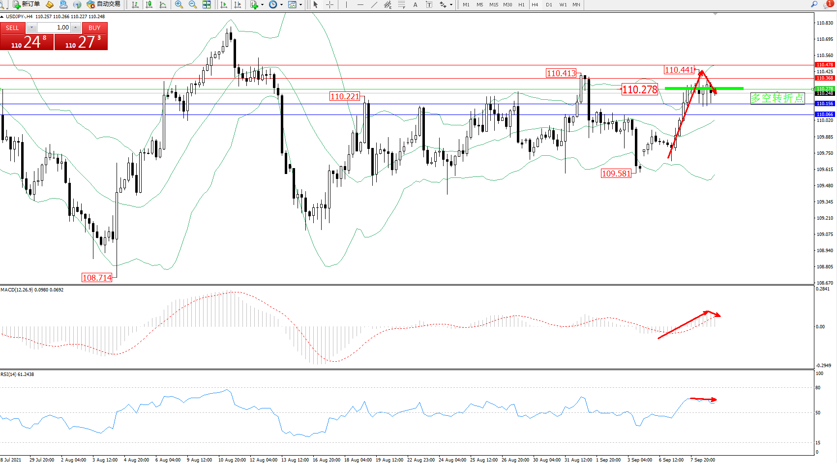 备选策略:110.278上方看涨,目标110.368、110.478