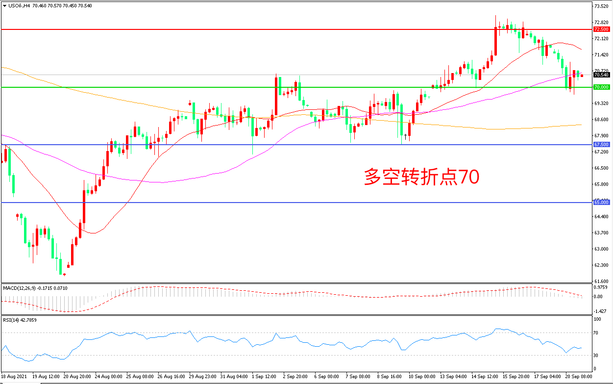 4小时图看,油价整体呈现冲高回落形态,但70美元依然成为下方明显支撑,MACD红柱缩短,RSI指标走平,日内小幅反弹概率较大。
