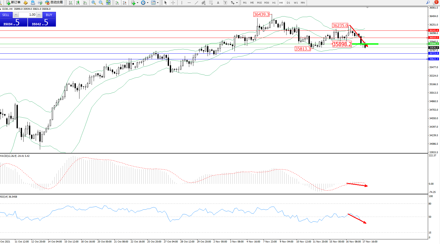 道琼斯指数DJ30——4小时K线图显示: