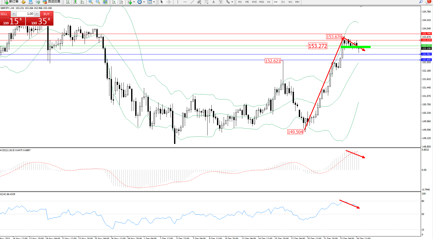 备选策略:153.272上方看涨,目标153.519、153.799