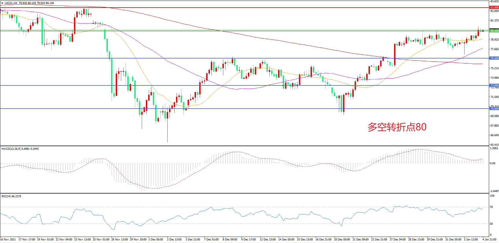 4小时图看,油价以21周期均线为依托震荡走高,短期走势偏强,80美元成为多空分水岭,MACD红柱增加,RSI指标走平,日内震荡上行概率较大。