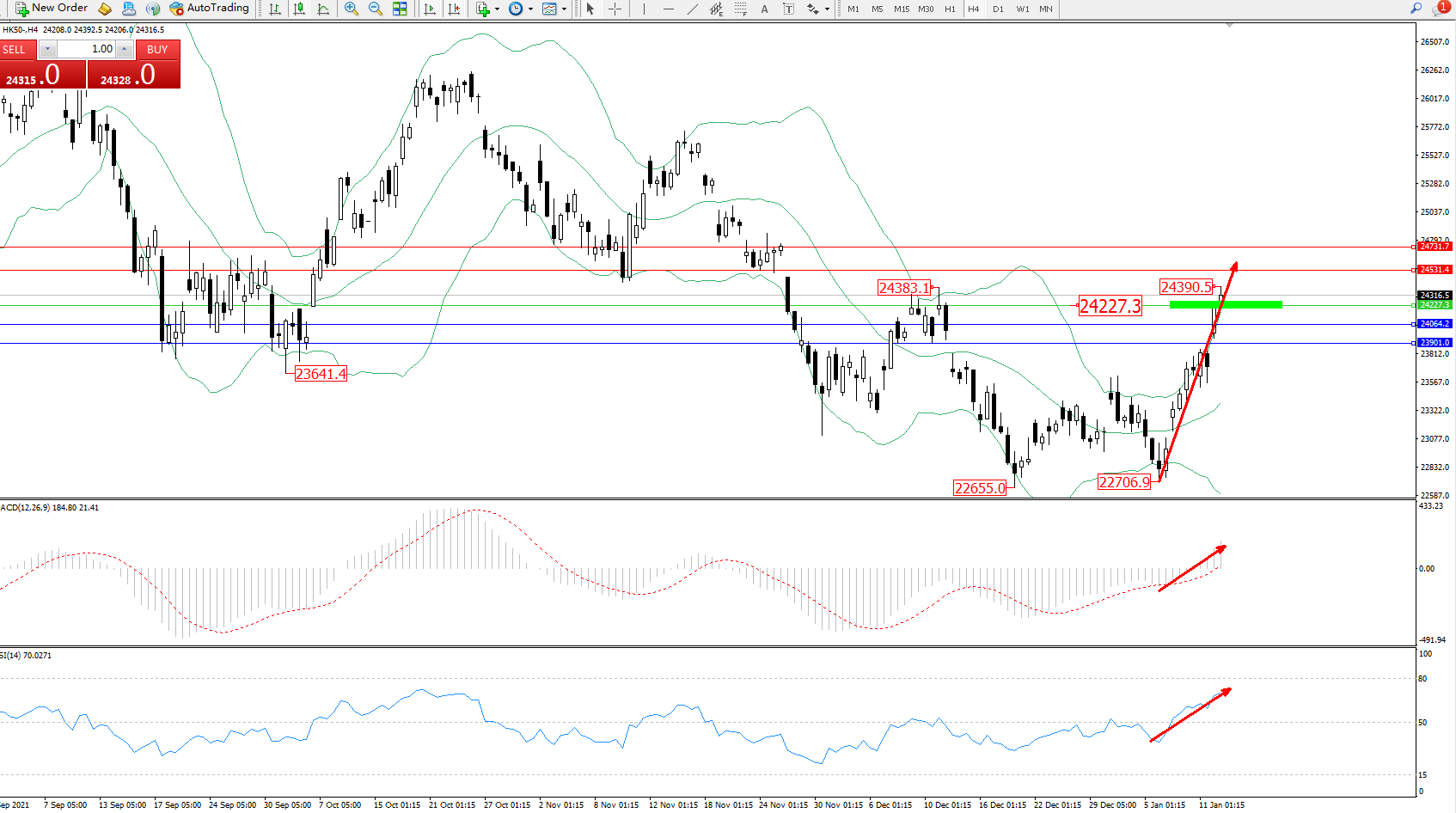 恒指HK50 ——4小时K线图显示: