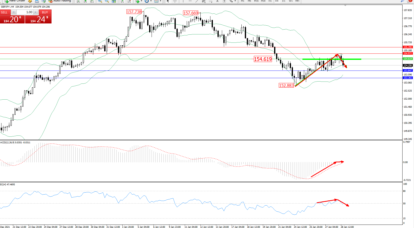 交易策略:154.619下方看跌,目标153.847、153.365