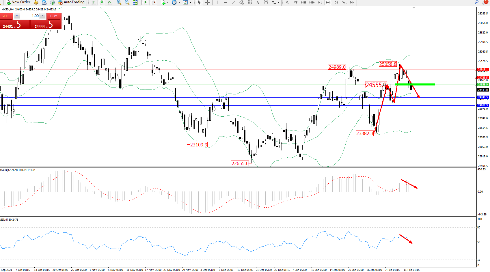 恒指HK50 ——4小时K线图显示: