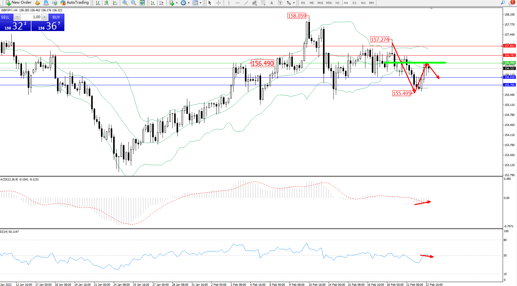 交易策略:156.490下方看跌,目标156.018、156.766