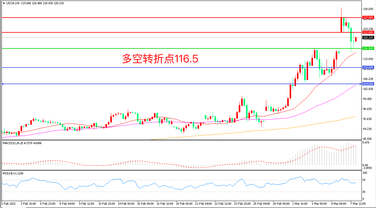 周一(3月7日),第三轮俄乌谈判无实质结果,美国考虑禁止进口俄罗斯产油令投资者仍然担心油市供应危机,美国WTI原油高开后回补缺口,收报120.21美元/桶。目前原油供应层面处在高弹性的不稳定状态下,偏紧预期是共识,油价相对易涨难跌,空前的供应紧张和市场情绪作用下,油价延续强势概率较大。