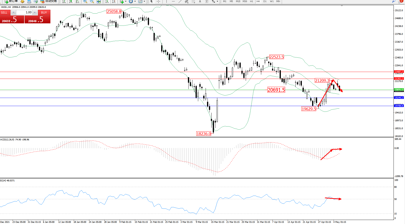 恒指HK50 ——4小时K线图显示: