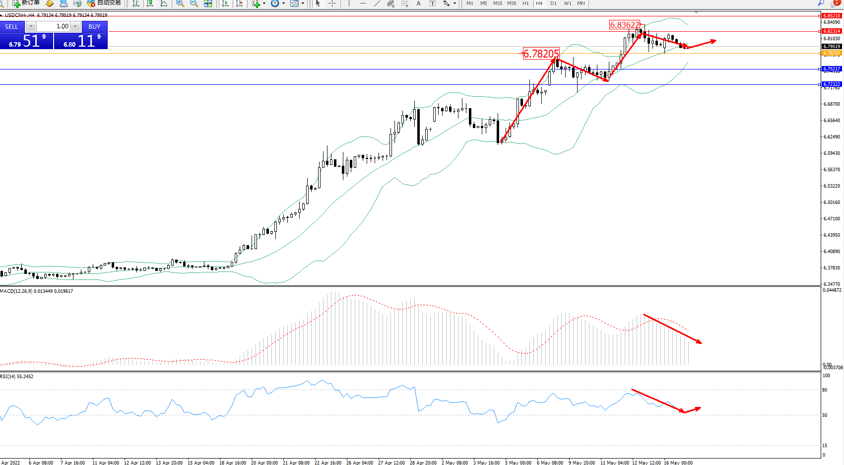 技术点评:多头动力延续布林带指标通道中上轨区间持续震荡上扬,高位抵达6.83622附近节点后开始整理短期高位开始短暂平移,布林带指标呈上行趋势走势后开始收口中,MACD指标处于多头区域维持弱势不断下移,RSI指标处于多头区域维持震荡回撤后开始平移;