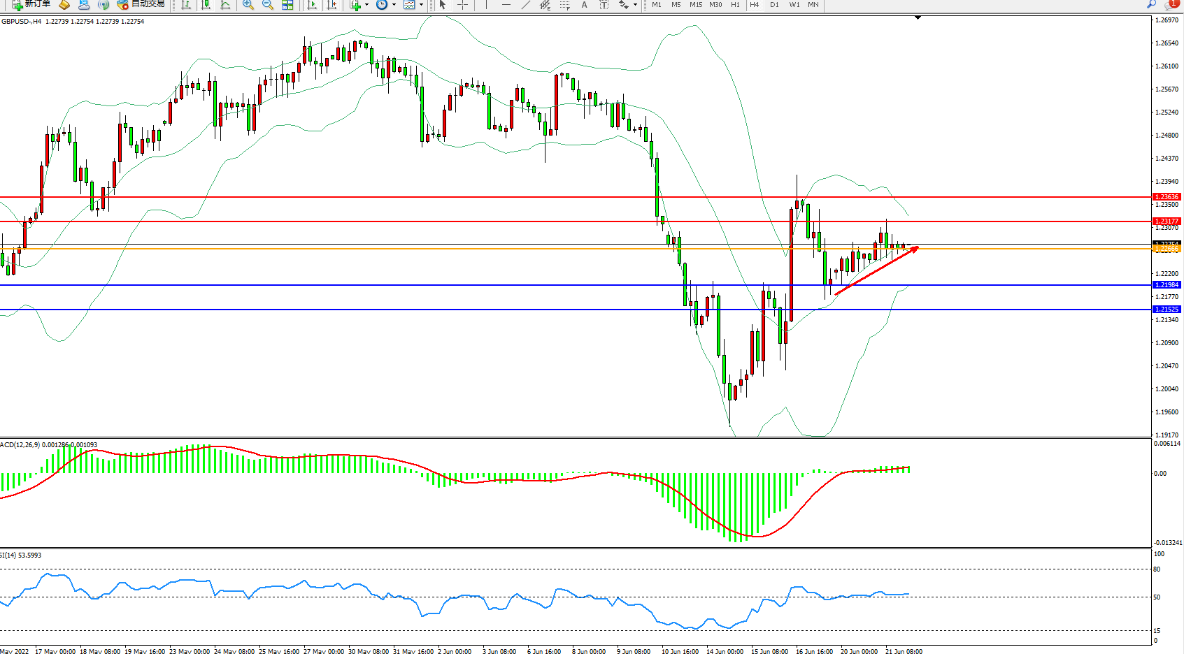 交易策略:1.22666上方看涨,目标1.23177、1.23636