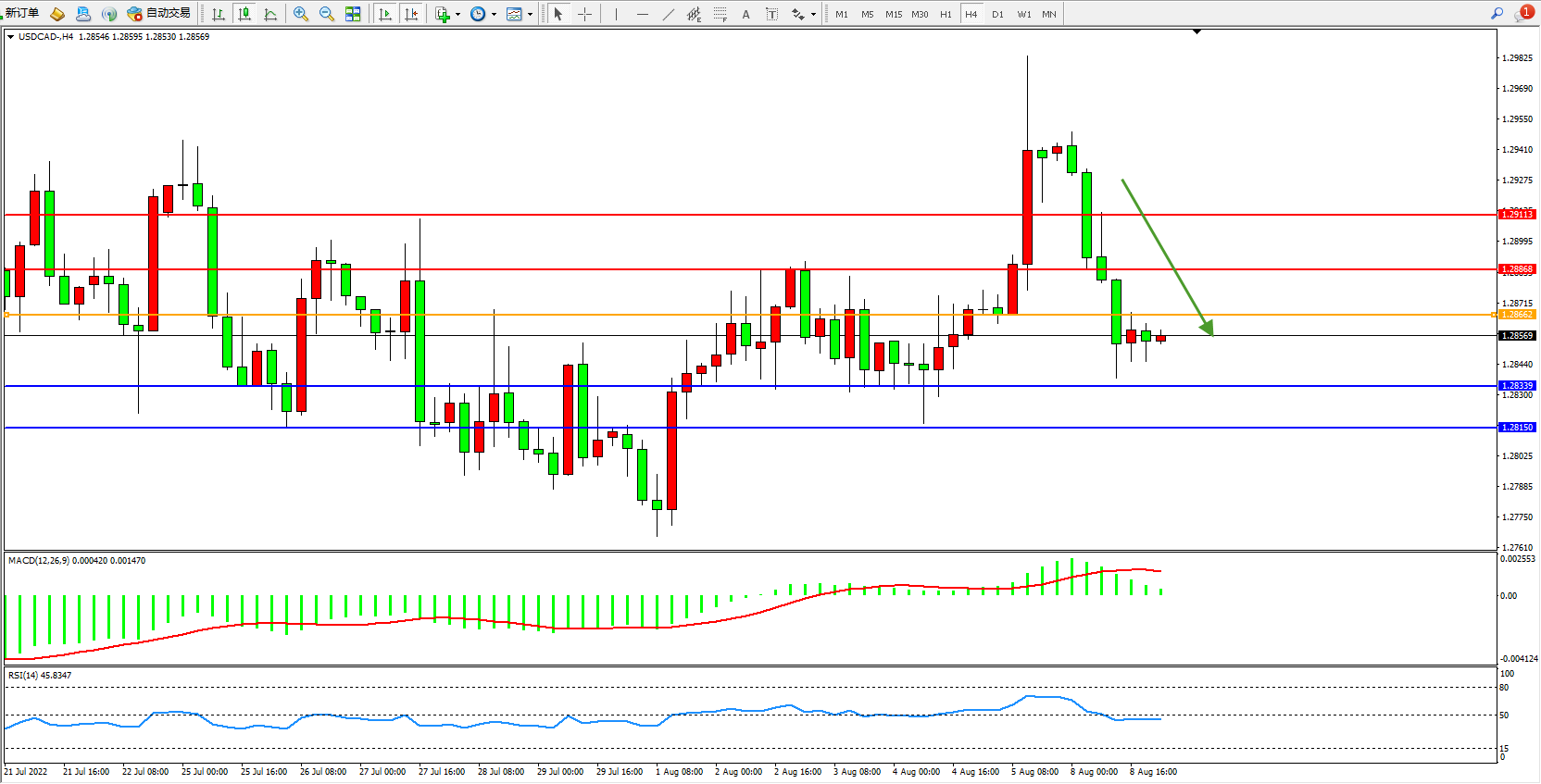 美元加元USDCAD——4小时K线图显示: