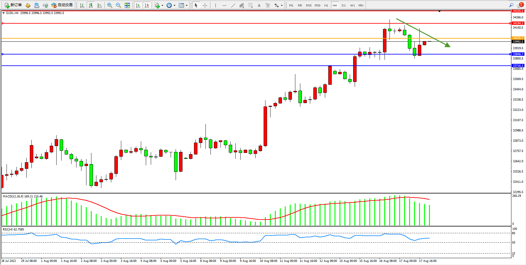 道琼斯指数DJ30——4小时K线图显示:
