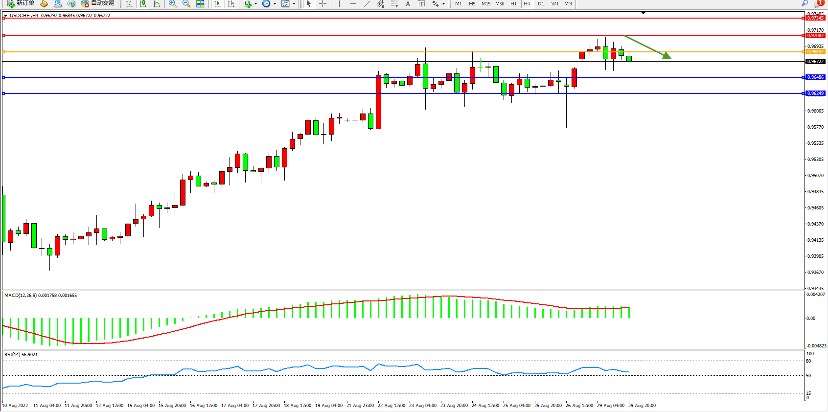 美元瑞郎USDCHF——4小时K线图显示: