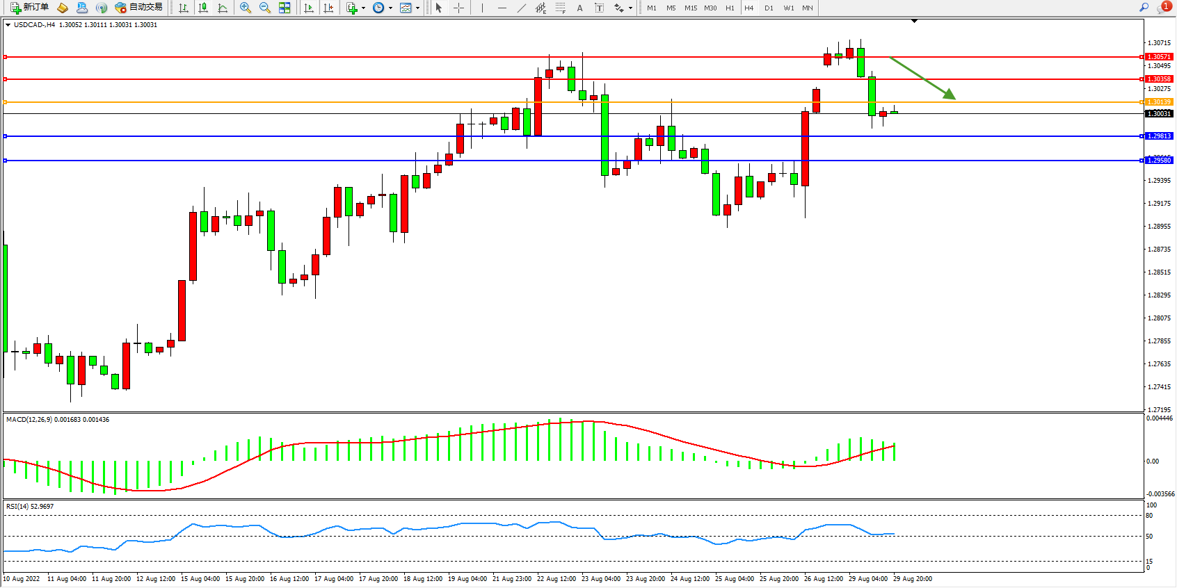 美元加元USDCAD——4小时K线图显示: