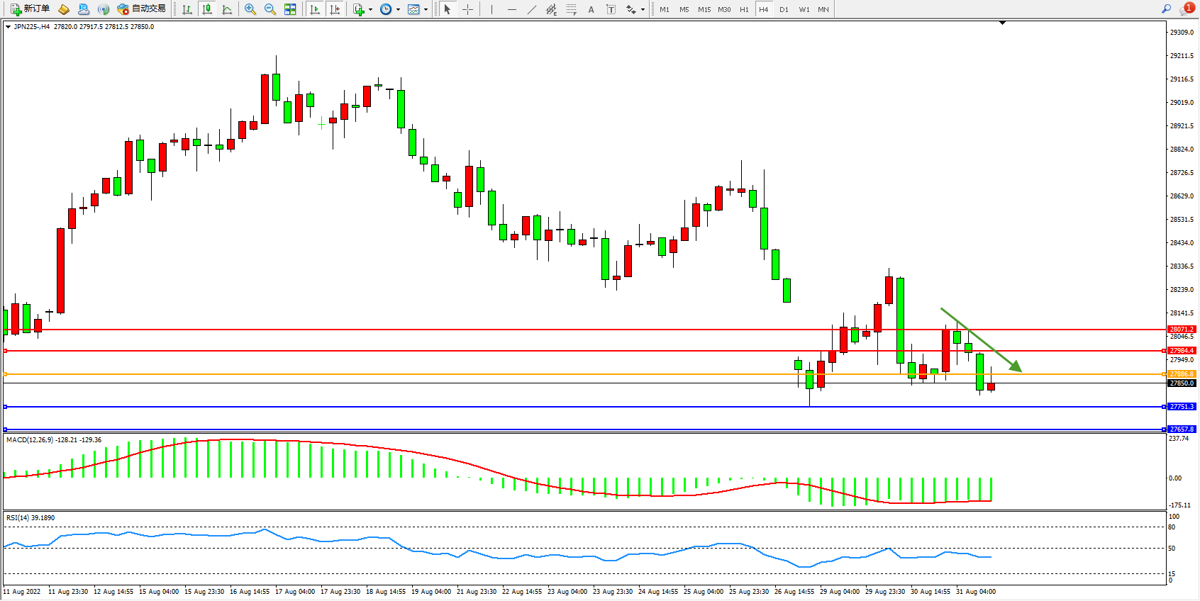 日经指数JPN225——4小时K线图显示: