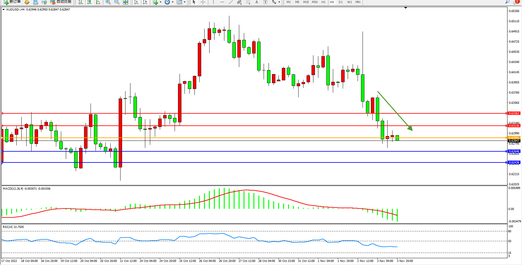 澳元美元AUDUSD——4小时K线图显示: