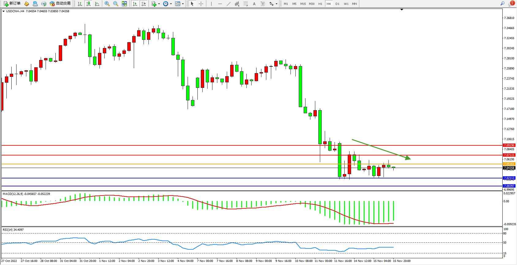 美元人民币USDCNH——4小时K线图显示: