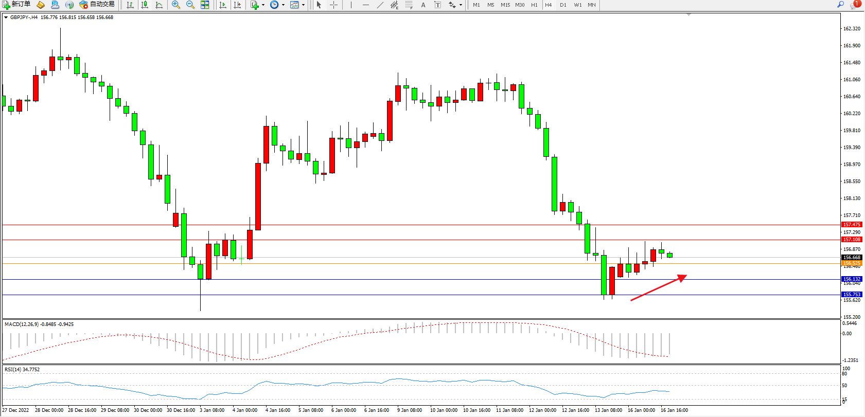 备选策略:156.525下方看跌,目标156.132、155.753