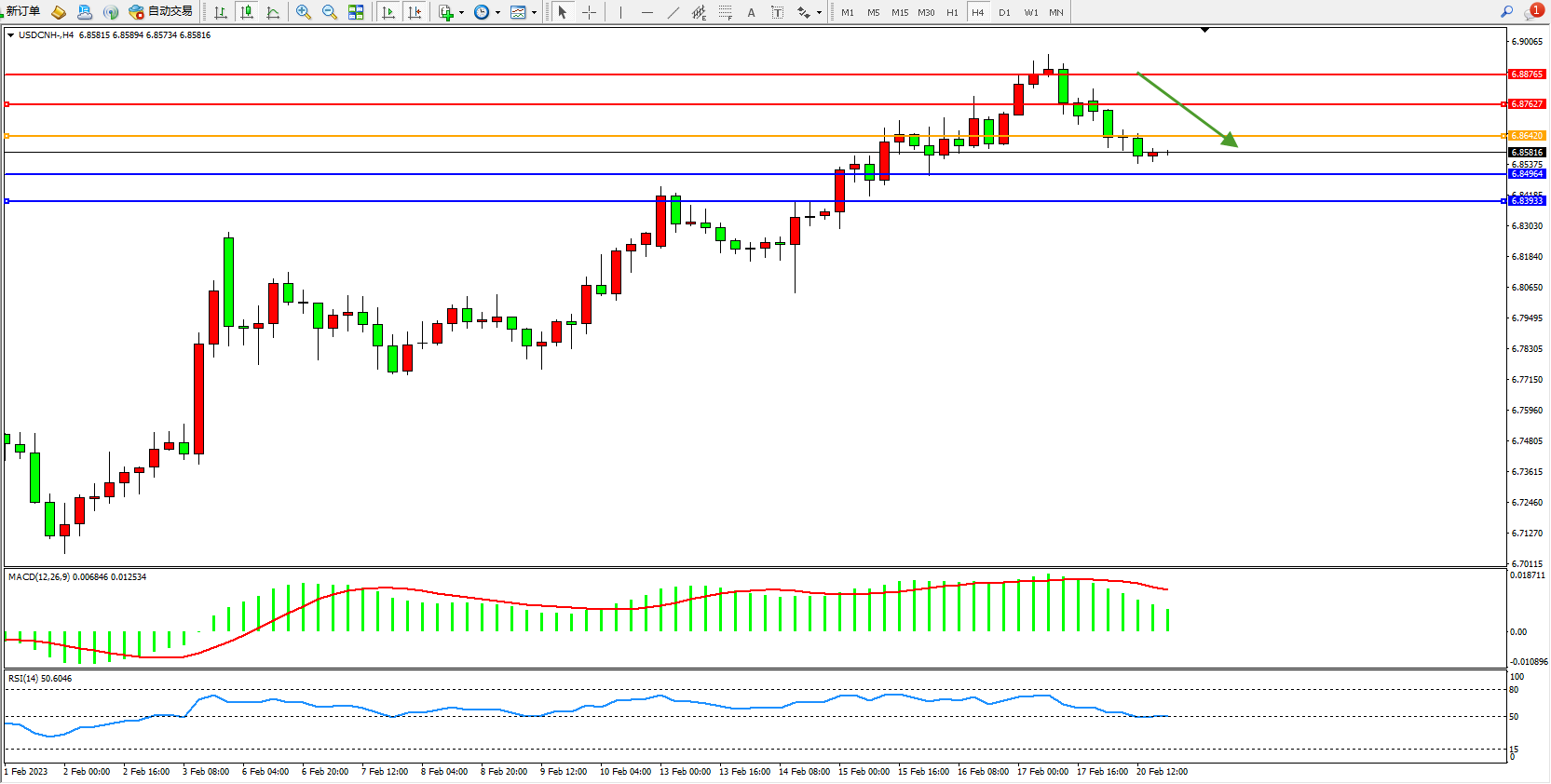 美元人民币USDCNH——4小时K线图显示: