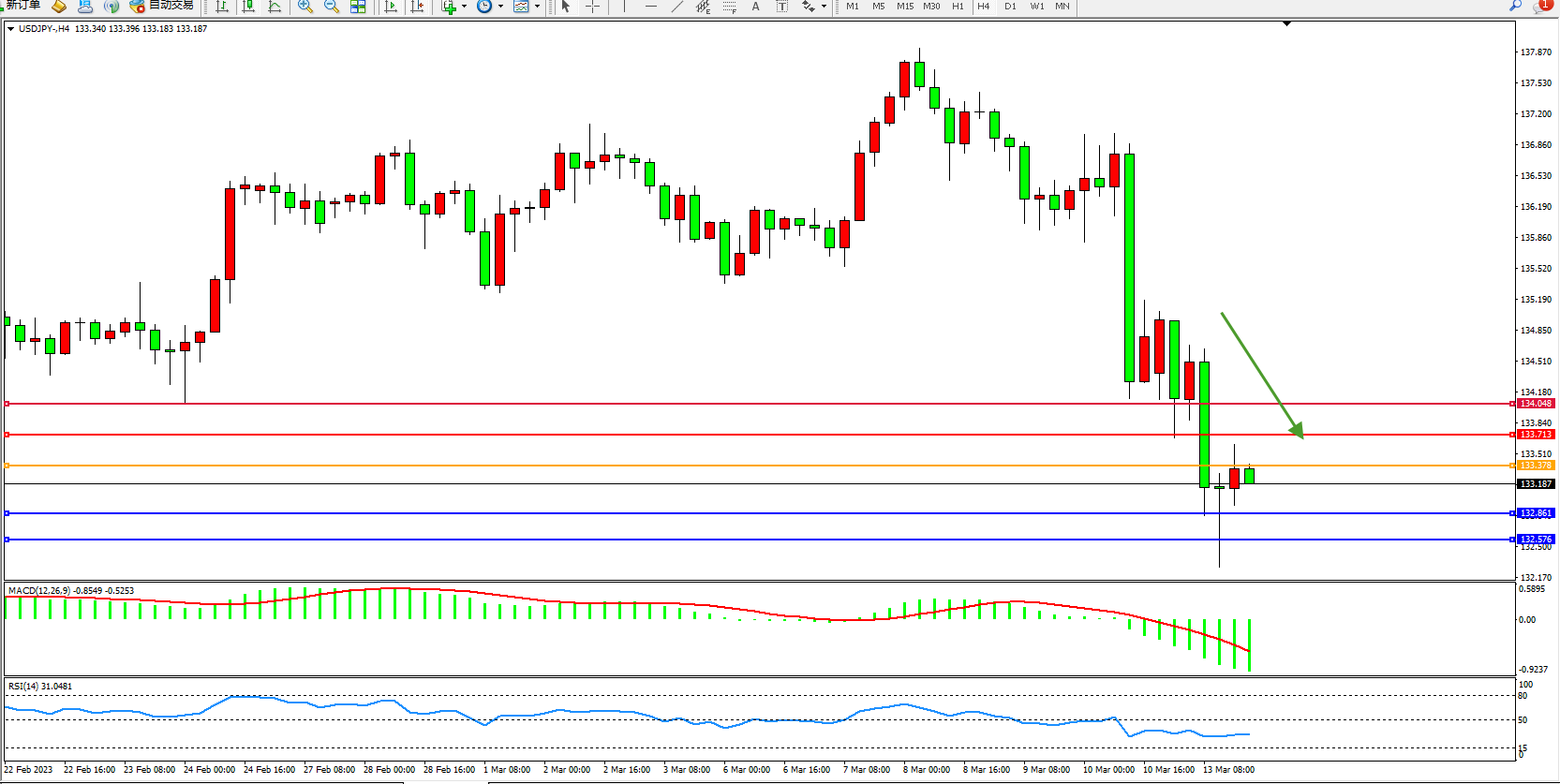 交易策略:133.378下方看跌,目标132.861  132.576