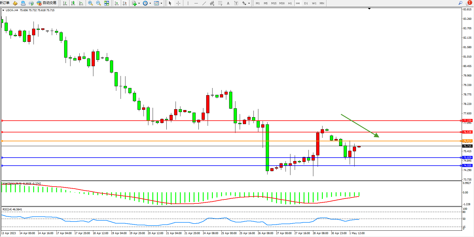 交易策略:76.013下方看跌,目标75.029  74.555