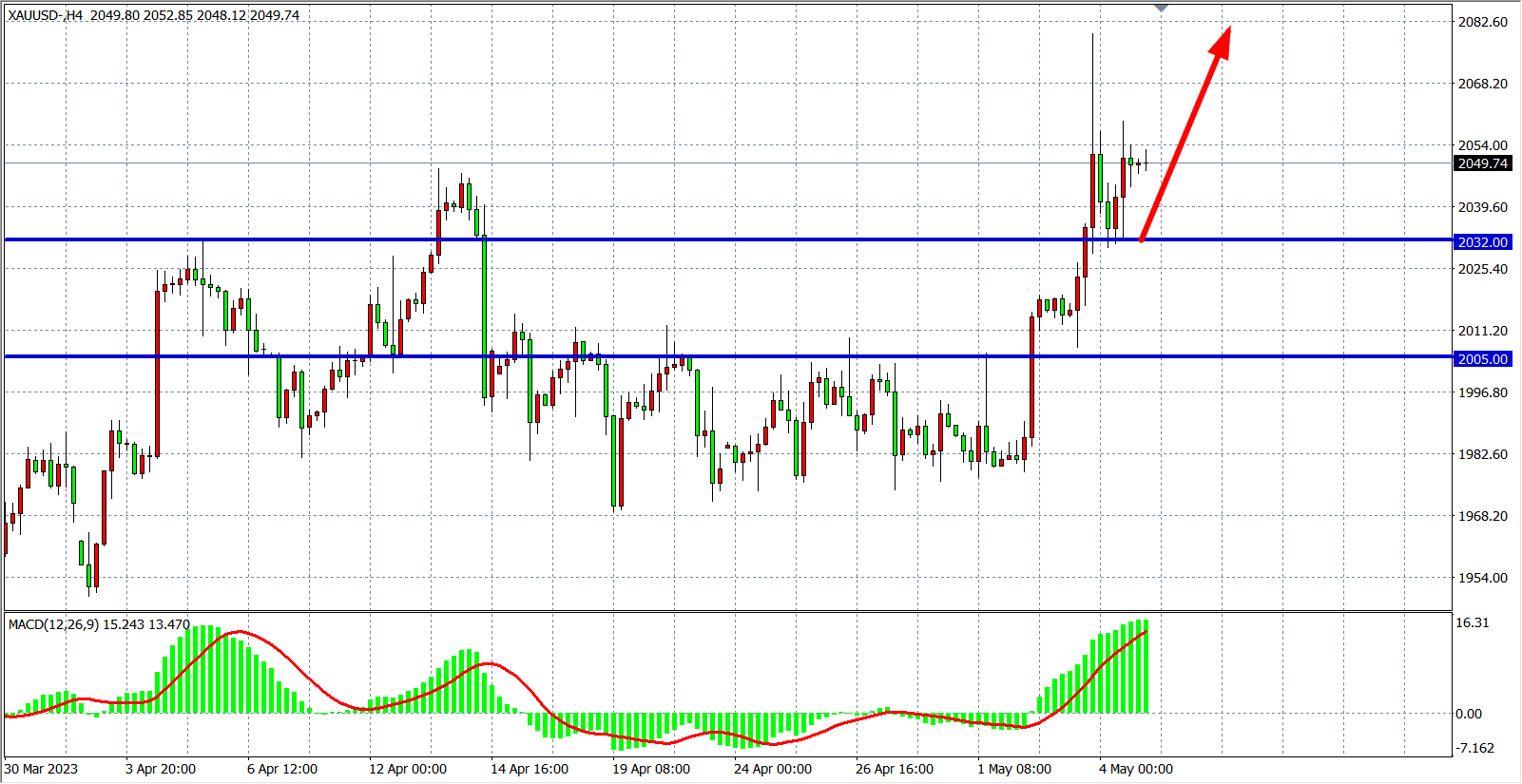 4小时图看,黄金在2032支撑之上继续走高,同时MACD量能在零轴之上大幅均匀放量,行情延续强势多头,目前支撑上移至2032附近,维持在2032之上继续看涨,上方目标2060-2080附近。