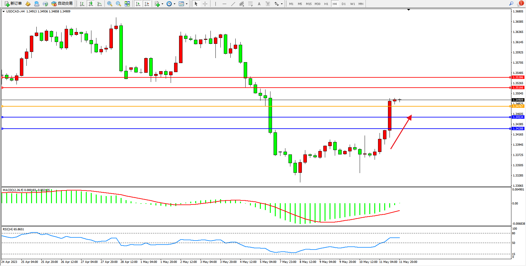 美元加元USDCAD——4小时K线图显示: